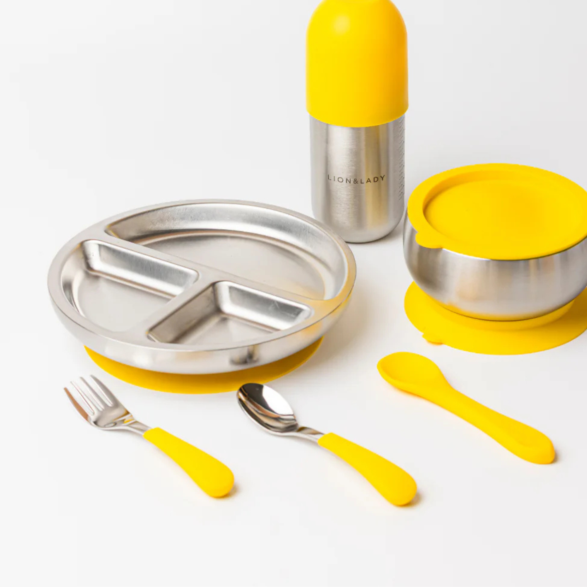 Stainless Steel Toddler Plate, Spoon And Fork Set Buttercup Yellow