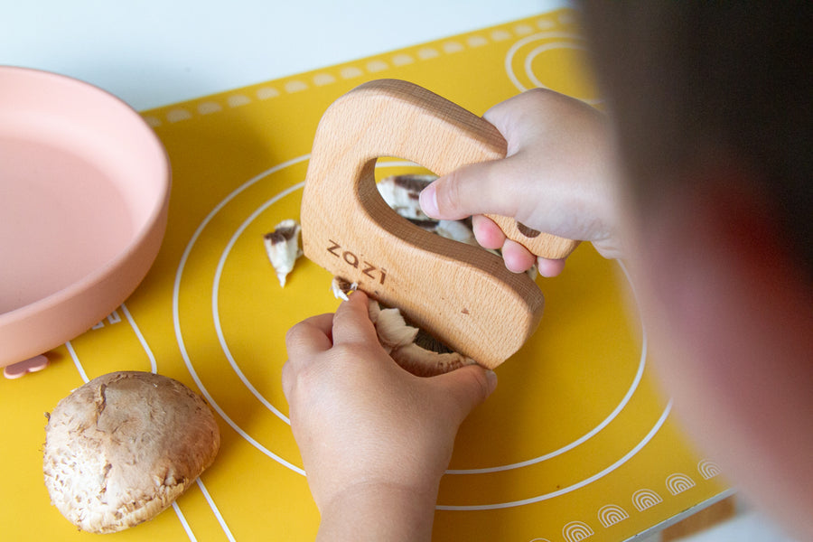 Best used with softer foods such as such as bananas, mushrooms, peaches, avocado, apple, watermelon, pineapple, tomatoes, cheese, bread or anything pre boiled. This is essentially a blunt knife, so a lot of pressure would be required to chop through something like a carrot - make sure you’re setting your little one up for success when you’re choosing your foods!