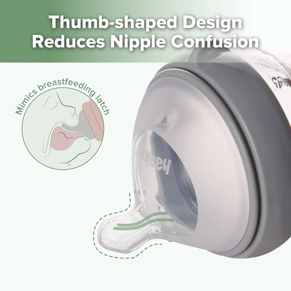 The Haakaa Gen. 3 Glass Baby Bottle is designed to provide the most natural feeding experience possible for you and your baby. The orthodontic thumb-shaped teat mimics the shape of a mother’s nipple during breastfeeding, and the offset position allows you to feed your baby without completely inverting the bottle. The anti-colic vent allows your baby to feed continuously without taking in air bubbles or having to gasp for air between latches. Our glass bottles are made from temperature-resistant borosilicate glass, making them safe to heat and freeze and perfect for storing expressed breast milk!