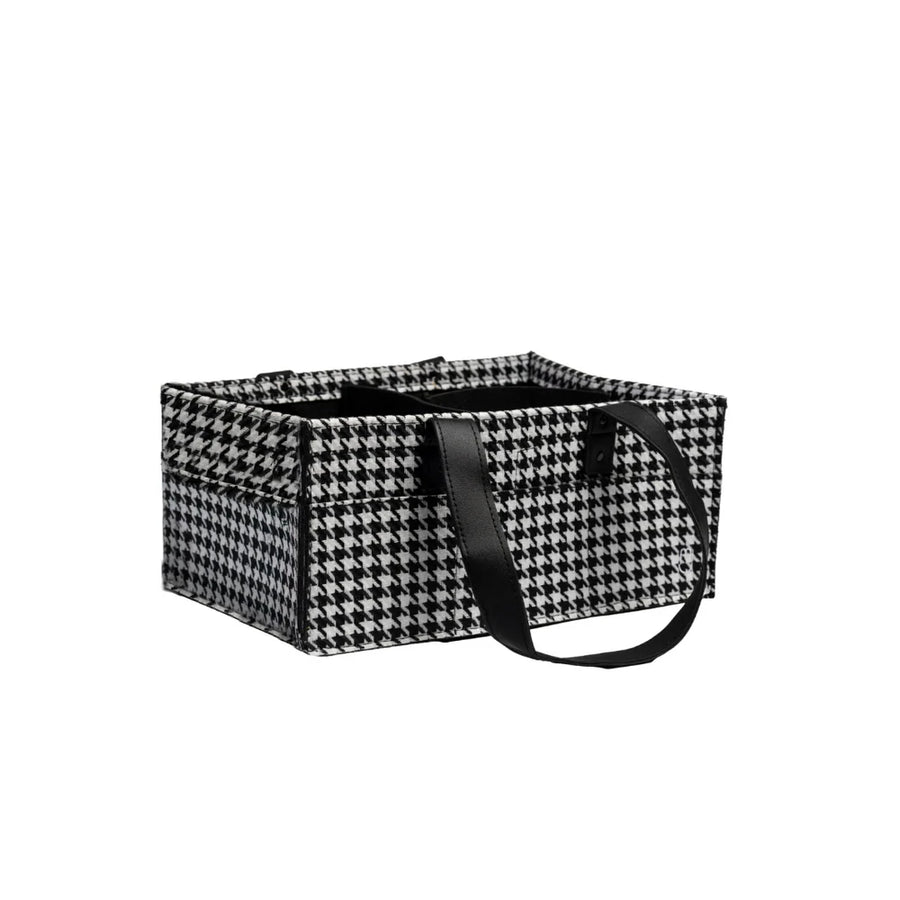 Our Mini Houndstooth Bunnie Caddie is crafted from premium felt fabric, offering a sturdy base and sectional design. It features leather trim and metal hardware for a sleek, sophisticated appearance, along with a durable and stylish strap for easy transport.