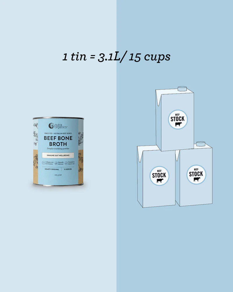 Small but mighty, the Nutra Organics Beef Bone Broth powder makes a huge 3.1L / 15.5 cups of nourishing broth. Just add hot water!